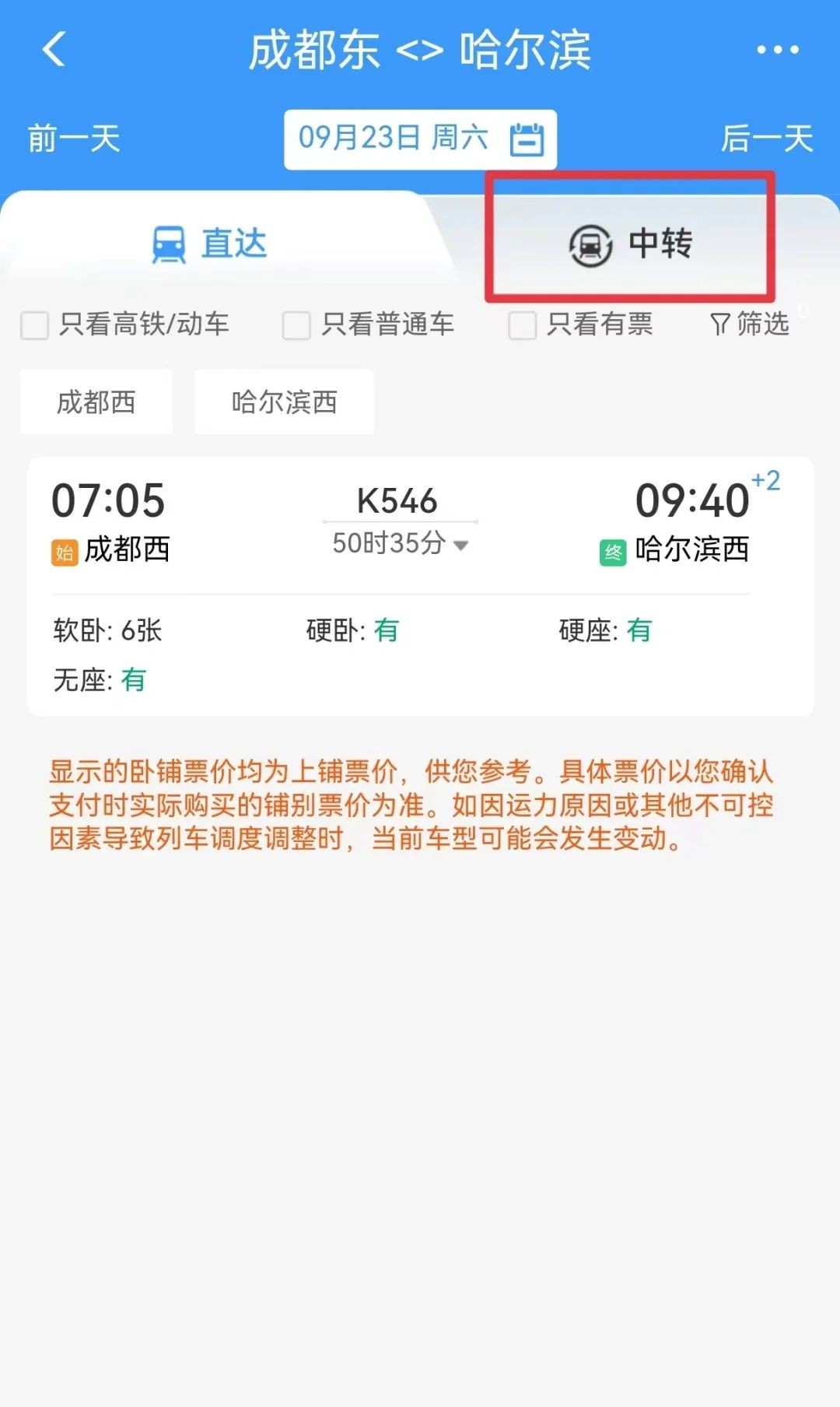 查询直达车票,仅有一趟直达列车,可以点击右上方“中转”,铁路12306将根据旅客出行需求和余票情况,智能推荐有余票的中转换乘方案,供旅客选择。