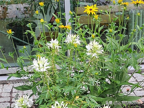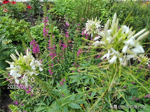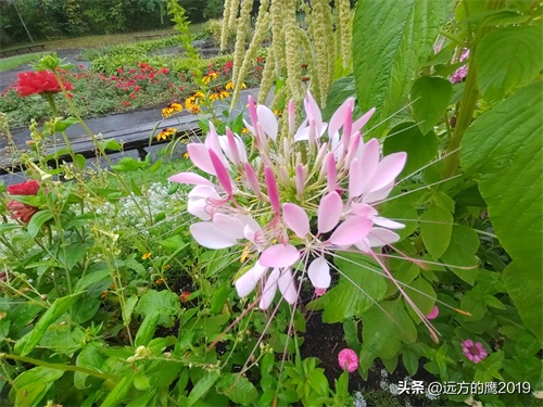 这是在夏宫后花园拍的,这里的醉蝶花也都是和步步高等其他花草植物搭配一起的花镜,有白色、粉色和玫红色醉蝶花,轻盈飘逸的花瓣似蝴蝶飞舞。
