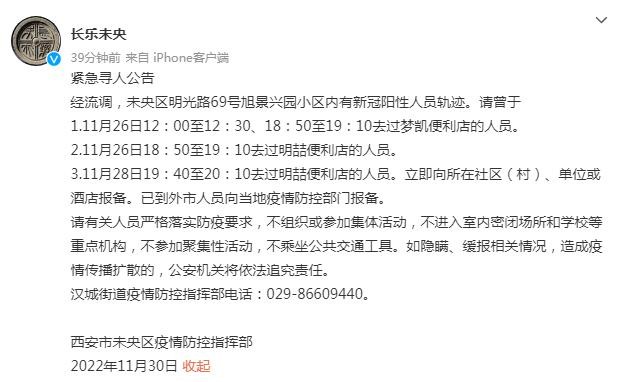 11月30日,西安市未央区发布紧急寻人公告,经流调,未央区明光路69号旭景兴园小区内有新冠阳性人员轨迹。