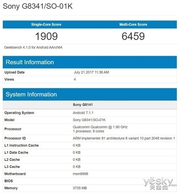 索尼Xperia XZ1跑分曝光:骁龙835+4GB内存