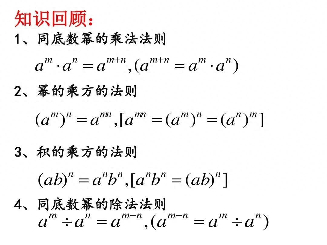 初中数学在幂的运算当中,涉及到同底数幂的的相乘或者相除。以及幂的乘方和积的乘方!我们只要记住这四个公式,做题就会迎刃而解。