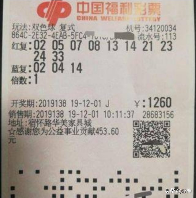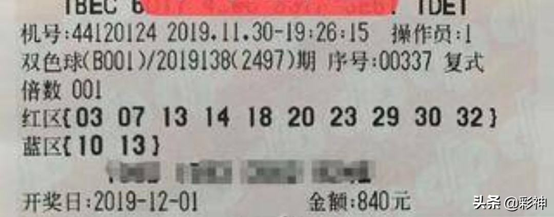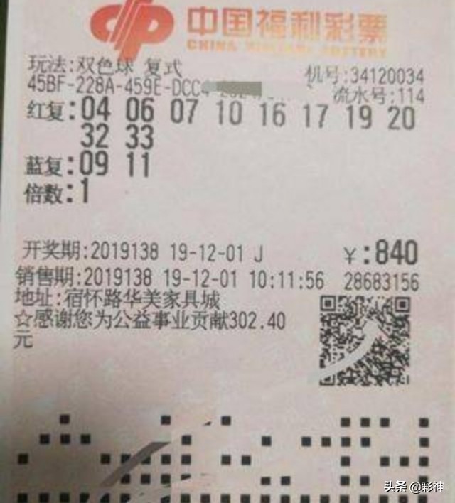 彩民晒出的这张双色球138期彩票是采用10+2的复试投注方式共投入840元。