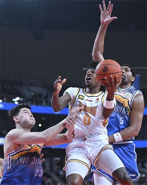 12月22日,山西汾酒队球员古德温(中)在新疆伊力特队球员劳森(右)、阿不都沙拉木的防守下上篮。新华社记者 胡虎虎 摄