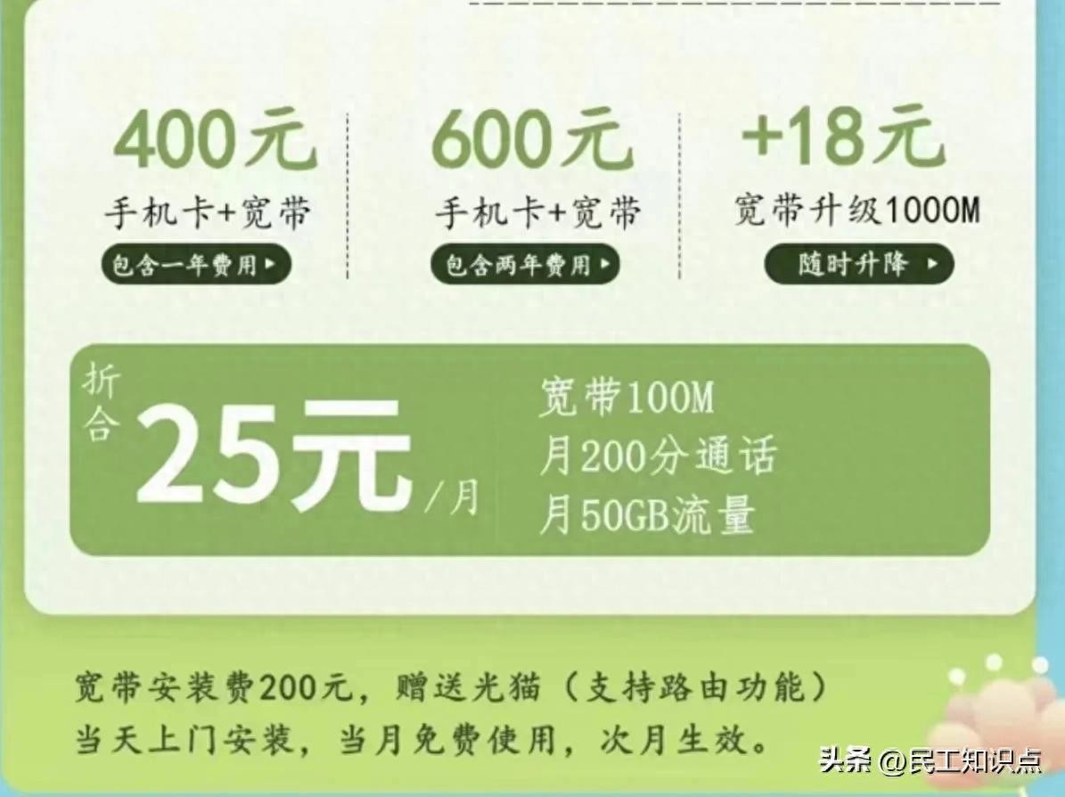 北京移动出手了,推出600元包两年宽带:另赠送手机卡1张每月包含200分钟全国通话,50G通用流量(30全国+20北京)送一条100M宽带+18元升级1000M宽带。随时升降!超出资费:通话0.1元/分钟,流量1元/G每天,北京地区免费上门办理。