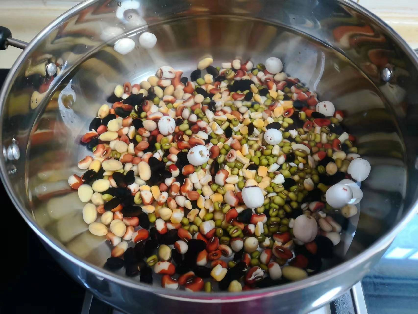 5、将豆类的食材一同放入锅里加足量清水,煮开后转小火煮上40分钟左右,豆类煮至饱满半熟状态。