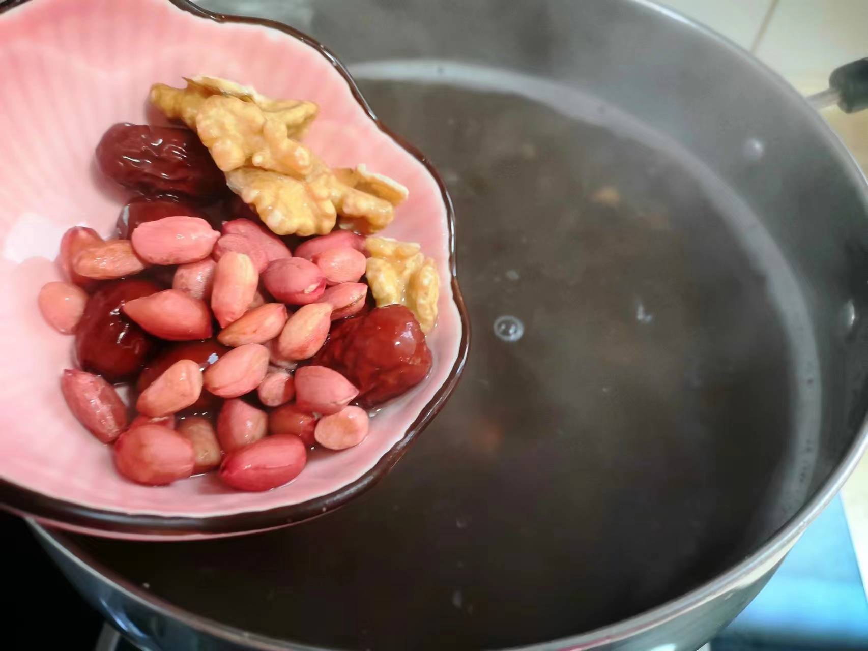 6、加入大米,糯米,小米、红米,麦仁,红枣,花生,核桃仁用手掰小点,也加入锅中一起煮。