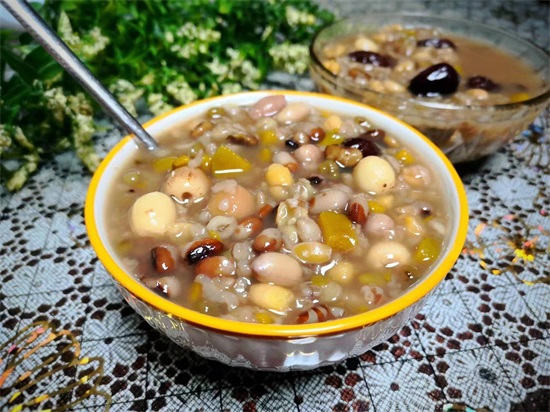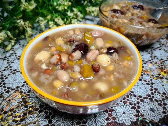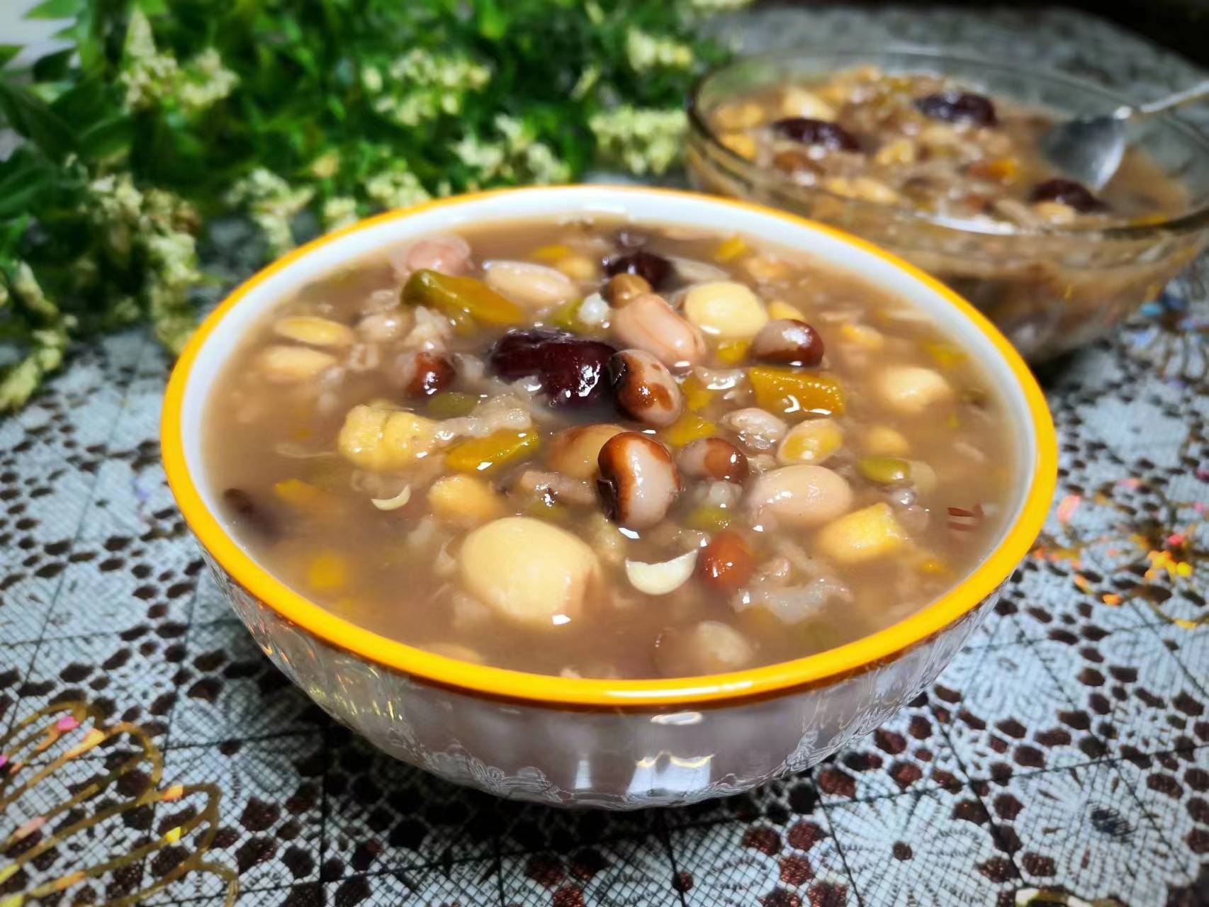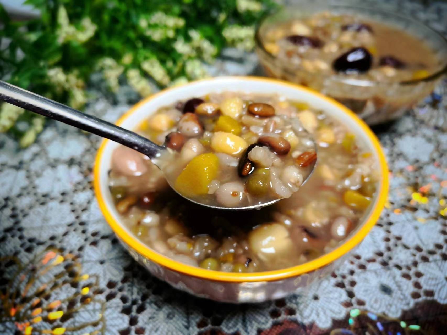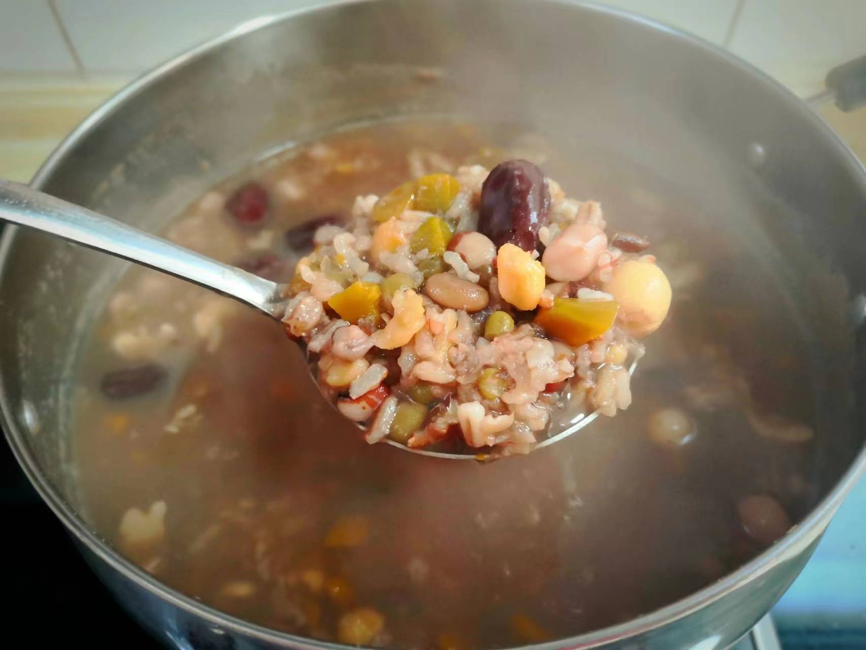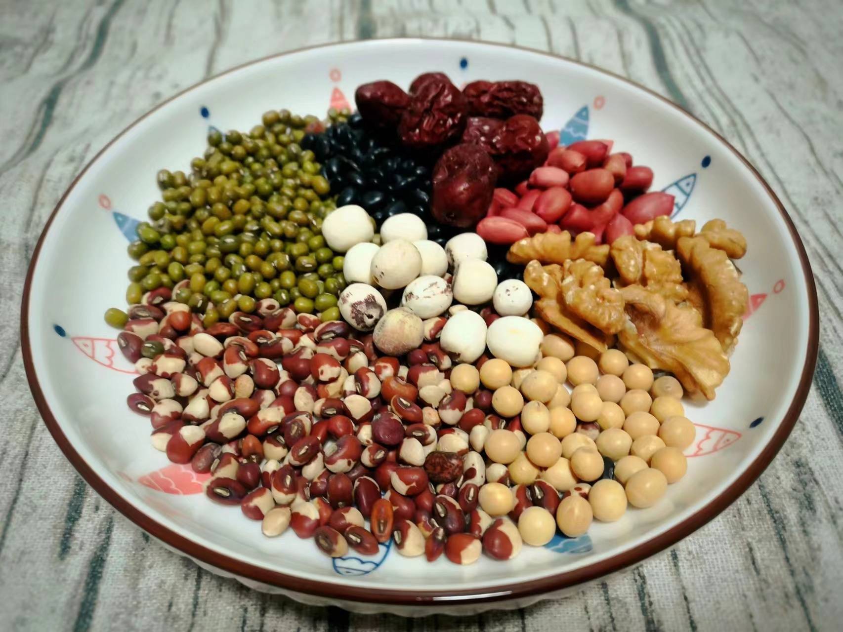 食材:熊猫豆、黄豆、黑豆、绿豆、红枣、莲子、花生、核桃仁、糯米、大米、麦仁、玉米粒、红米、南瓜、老冰糖。