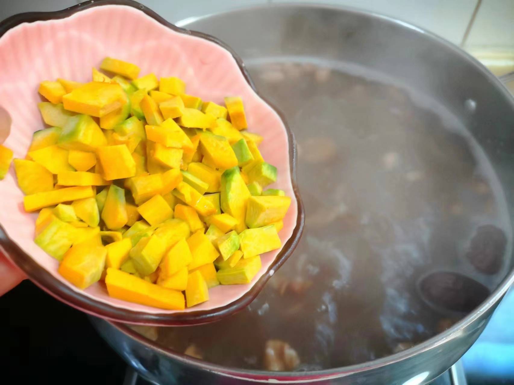 7、期间要搅动几次防止粘锅,继续煮20分钟后,再加入南瓜粒,煮10分钟,煮到米粒软糯,豆粒酥烂,粥变浓稠。