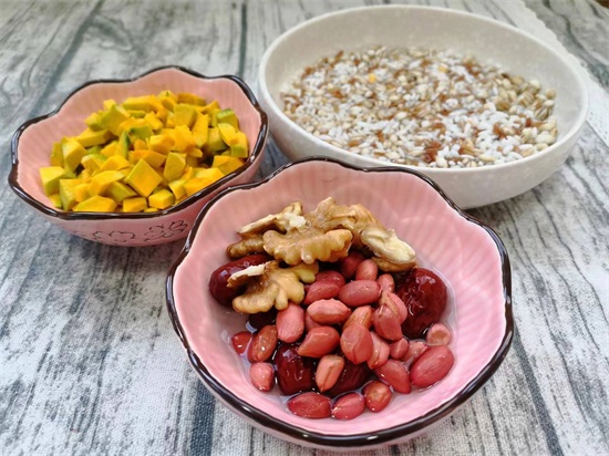 4、将大米,糯米,小米、红米,麦仁洗净加入清水浸泡上三个小时,红枣,核桃仁,花生冲洗干净,南瓜去掉外皮,切成小丁。