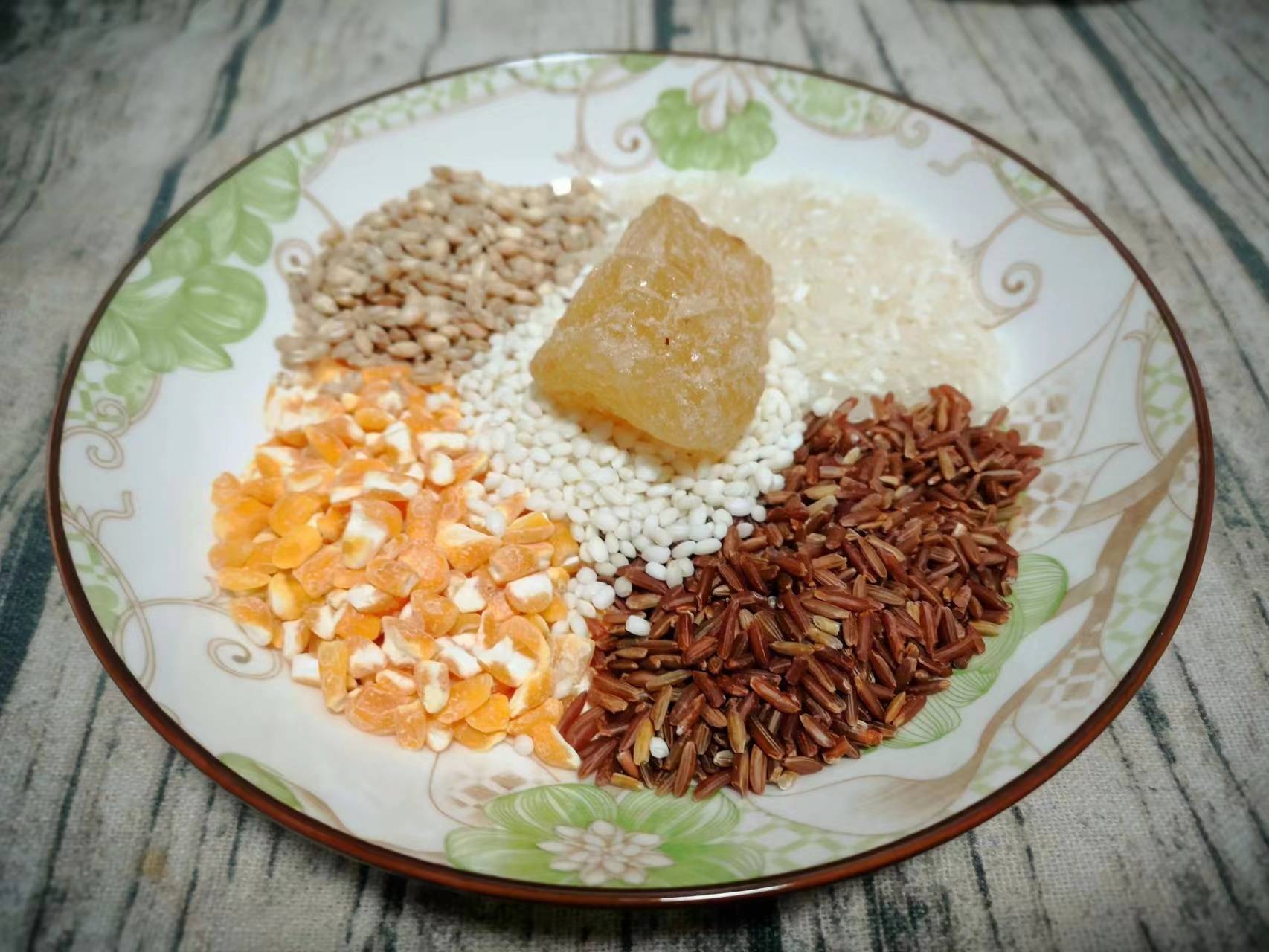 2、还需要准备一些糯米,大米,麦仁,玉米粒,红米各少许,南瓜一小块,冰糖一块。