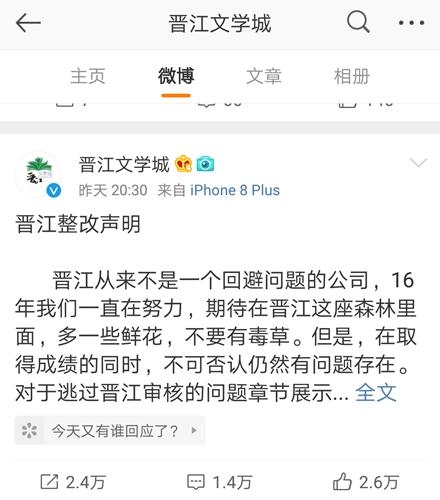 24日凌晨,微博认证为“晋江文学城站长冰心”的“晋江iceheart”发文回应称,在交流中深切地感受到有关部门及领导希望帮助网站健康成长的态度,“也希望大家和我们一同珍惜这次整改的机会,积极寻找网文写作的正确道路”。