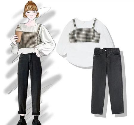 第二款日常穿搭也要呈现给大家,上装先穿上一件白色初春甜美圆领灯笼袖长袖衬衫,衬衫宽松的版型穿起来尽显慵懒随性之感,白色衬衫是微透面料,穿起来舒适轻透,但是为了防止走光可以外穿一件黑白格纹小吊带背心,黑白格纹经典前卫,复古的灯笼袖时尚大方, 此时我们可以在下装搭配上一件黑色直筒牛仔裤,修身显瘦的版型露出纤细修长的双腿,试问谁能抗拒大长腿的诱惑,穿上后就是仙女本仙无疑啦。
