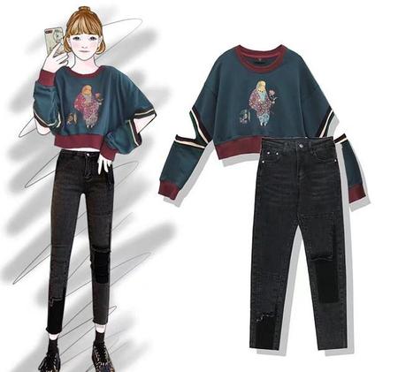 今天要给大家介绍的第1款日常穿搭上装是一件藏青色减龄印花卫衣,藏青色卫衣落肩袖设计充满小心机,短款版型露出一截纤细的腰肢,不规则袖口设计自带新鲜感,时尚又前卫,前胸处精美复古的印花图案趣味十足,色彩绚丽,卫衣的领口处、袖口处、衣摆处是枣红色拼接,与藏蓝色相辅相成,完美契合,此时下装搭配上一件深灰色高腰拼接不规则牛仔裤,这款牛仔裤是收腰修身版型能够在视觉上起到拉长腿型的效果,让小仙女们看起来纤细显瘦,与此同时牛仔裤的裤脚处是撞色不规则拼接设计,增添了整体层次感,Fashion哦。