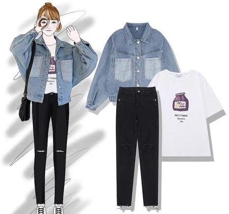 最后再为大家介绍最后一款日常穿搭,小仙女们可以先内穿一件常规的白色印花圆领T恤衫,下装搭配一件黑色修身显瘦破洞牛仔裤微直筒设计修饰腿部线条,高腰设计显得身材比例高挑,膝盖处的破洞设计自由率性,时尚感满满,裤脚处的撕边设计讨人喜爱,然后我们可以外穿一件浅蓝色帅气短款牛仔外套,牛仔外套是经典的百搭款式,对身材包容性强,任何风格的女孩子都能轻松驾驭。