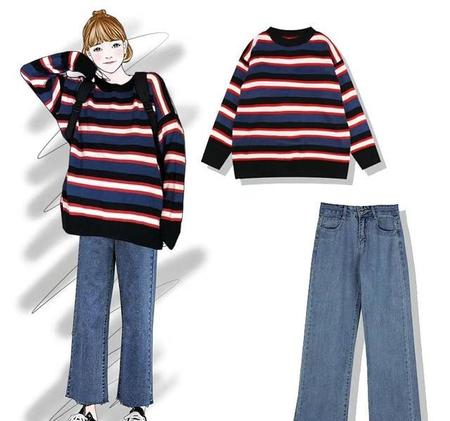 各位小仙女们再来看看第3款日常穿搭,我们在上装选择一件藏蓝色韩版宽松圆领条纹毛衣,慵懒风针织毛衣让你难以抗拒,这件针织毛衣将时尚完美的诠释,借此衬托出非凡的气质,针织毛衣圆领设计修饰小巧的脸型,下装搭配上一件浅蓝色复古高腰直筒阔腿牛仔裤,牛仔裤是宽松直筒裤的设计与针织毛衣一样可以巧妙的遮住全身上下的肉肉,微胖的小仙女们穿上后照样显得纤细苗条。