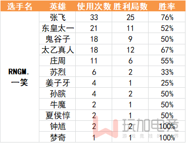 两个赛季来一笑共使用过12名英雄,使用次数最多和胜率最高的是张飞,一笑在采访中提到过张飞的容错率非常高。鬼谷子和太乙真人这样比较灵活的英雄一笑发挥的也不错。