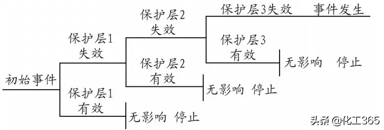 LOPA分析是一种特殊的事件树分析形势,如图所示,初始事件位于事件链的开始,并导致不期望发生的后果,为了降低不期望时间的发生频率,通过一个或者更多的保护层来防止事故发生,即通过各种安全保护措施及其失效概率将事故发生概率降低到可接受范围内,通过将风险水平和接受风险比较,最终可以确定附加系统的安全完整性等级(SIL)