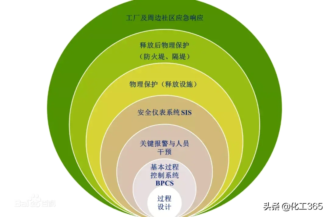 事件阻止层和后果减弱层,事件阻止层可以阻止潜在危险的发生;后果减弱层则是针对已经发生的危险,尽可能减少后 果的危害程度,降低损失。保护层分析的思想,可以用一个“洋葱”来形象地描述。外部设立多重保护层,以保证生产过程的安全运行。