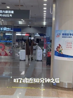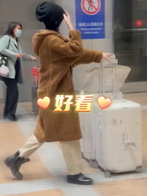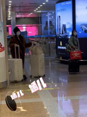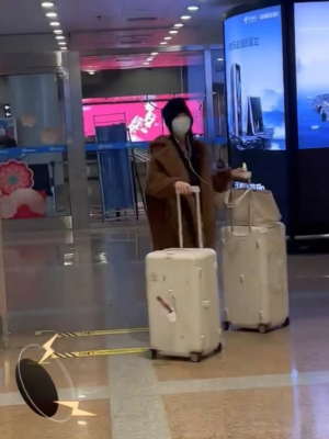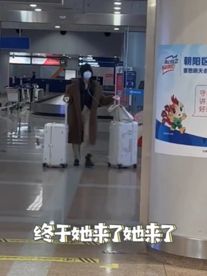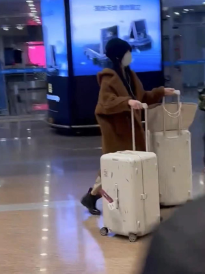 她推着两个行李箱,大步流星走出来的模样,仿佛模特走T台一般。
