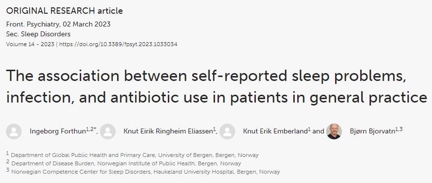 挪威卑尔根大学的研究人员在" Frontiers in Psychiatry "期刊上发表了一篇题为" The association between self-reported sleep problems,infection,and antibiotic use in patients in general practice "的研究论文。
