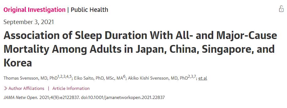 多国研究人员联合在" JAMA Network Open "期刊发表了一篇题为" Association of Sleep Duration With All-and Major-Cause Mortality Among Adults in Japan,China,Singapore,and Korea "的研究论文。