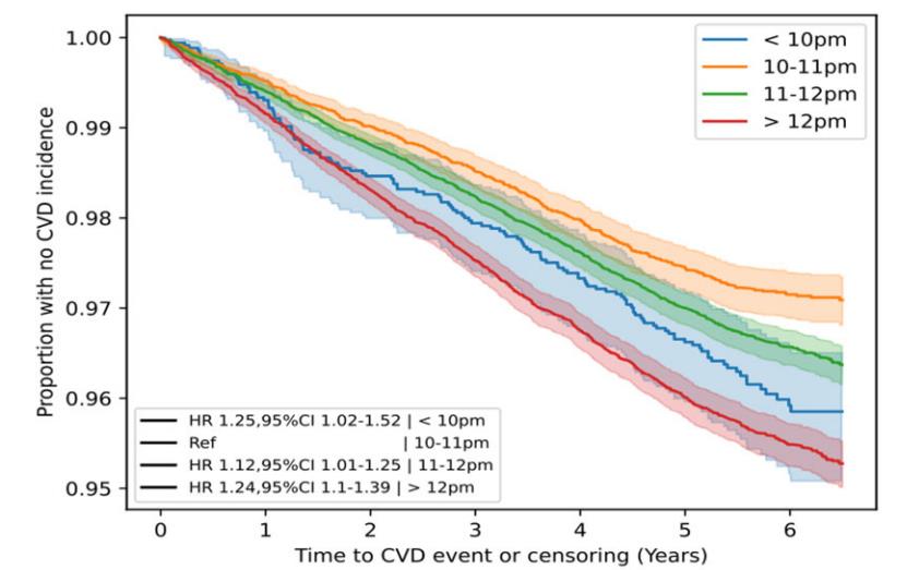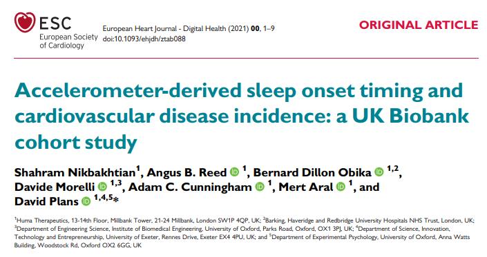 英国牛津大学的研究人员在《欧洲心脏病学会》旗下" European Heart Journal-Digital Health "期刊发表了一篇题为" Accelerometer-derived sleep onset timing and cardiovascular disease incidence:a UK Biobank cohort study "的研究论文。