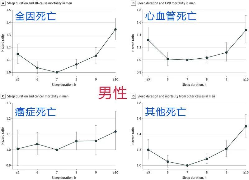 总的来说,在男性和女性中,7小时的睡眠时长是与全因死亡率、心血管疾病和其他原因死亡率相关的最低点。