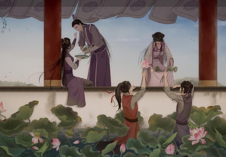 吃完晚饭大家也该各回各家了,这边云梦江氏热闹的很,一大家子正在摘莲蓬,虞夫人和江宗主两个在旁秀恩爱,而羡羡和江澄在当苦力,至于师姐,当然是照顾弟弟们了。这个画面太过美好,能让人忘记那些虐心的剧情,果然这张全家福才是江澄最期待的。