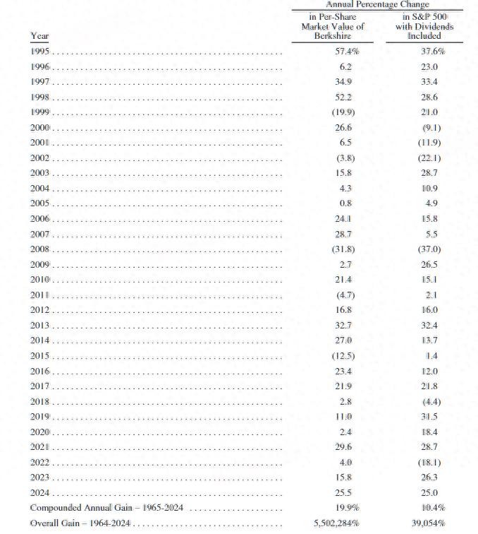 巴菲特在致股东公开信中表示,2024年,伯克希尔每股市值的增幅为25.5%,标普500指数为增长25个百分点。长期来看,1965-2024年,伯克希尔每股市值的复合年增长率为19.9%,明显超过标普500指数的10.4%。而1964-2024年伯克希尔的市值增长率是令人吃惊的5,502,284% ,也就是550,22倍,而标普500指数为39,054%,即390倍。