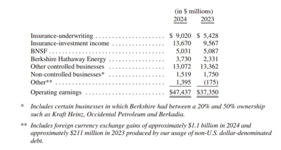 伯克希尔的铁路和公用事业业务(保险业务之外的两大业务)的总盈利有所改善。然而,这两项业务仍有很大的提升空间。2024年年底,我们将公用事业业务的持股比例从约92%增加到100%,成本约为39亿美元,其中29亿美元以现金支付,余额以伯克希尔“B”类股票支付。