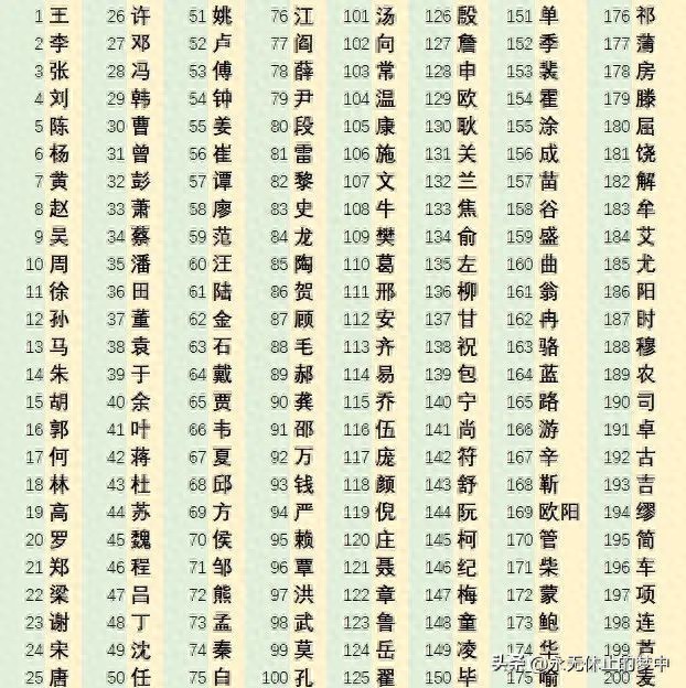 一、最新百家姓排名,前200姓氏: