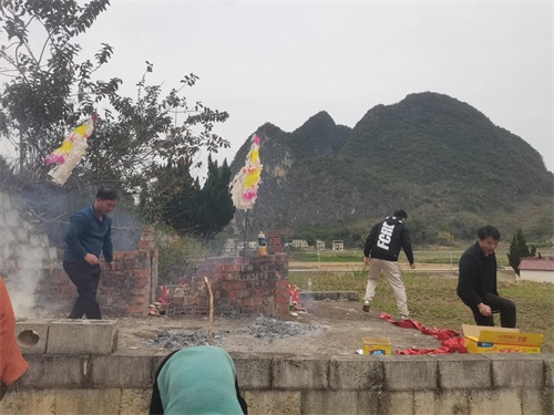 壮族对祖坟的祭扫是十分认真的,把五色糯米饭和各种食物摆在祖坟前,烧上香烛之后,子孙们便动手把坟上的杂草铲除干净,然后培上新土,插一串花纸在墓上使之随风飘扬。从所插花纸特征来看,可能与道教思想有关。道教把类似这样的东西叫幡,做道场时一定要张挂类似这样的纸幡。子孙们集中后,排好队向祖宗拜三拜,烧上一串炮仗,然后收起祭品,并在坟边野餐。