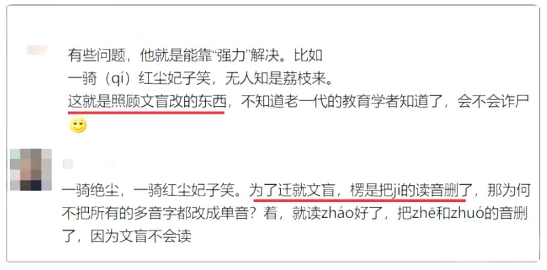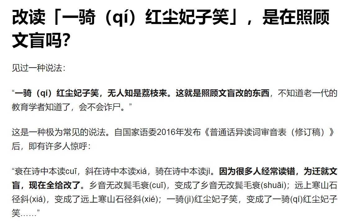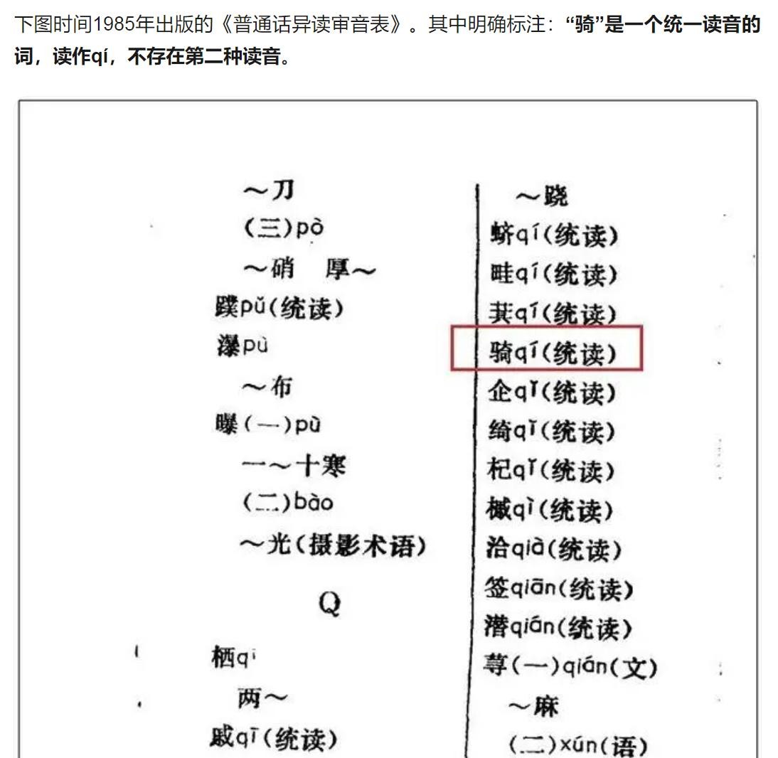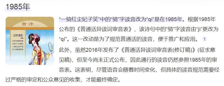 有网友晒出证据,依 1985 年公布的《普通话异读词审音表》,此诗句中“骑”字读音已由“jì”变更为“qí”。这一变动是为了对普通话读音予以规范。