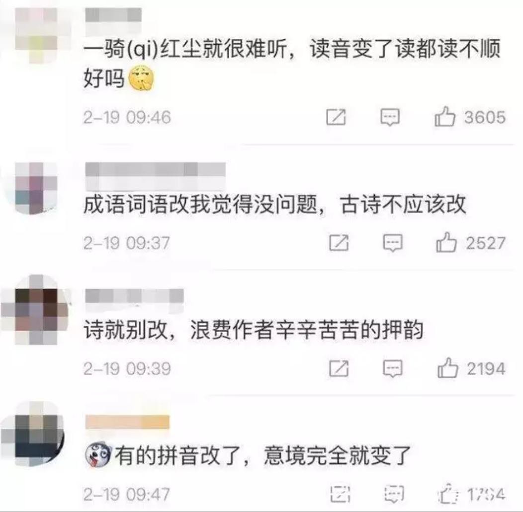更有一些评论说,这简直是在给文盲在开绿灯,为了迁就文盲,都给改了。可改了之后,古人当时写诗的感觉就完全没有了。