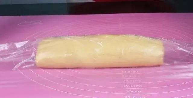 3.将面团放到擀面垫上,搓成这样的长条形,用保鲜膜包裹起来放到冰箱冷冻一下。