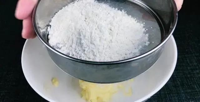 1.我们先再空碗中倒入软化后的黄油 40 克,做这种饼干黄油不能太硬,也不能完全融化,然后筛入200 克的低筋面粉,加入30克白糖粉。
