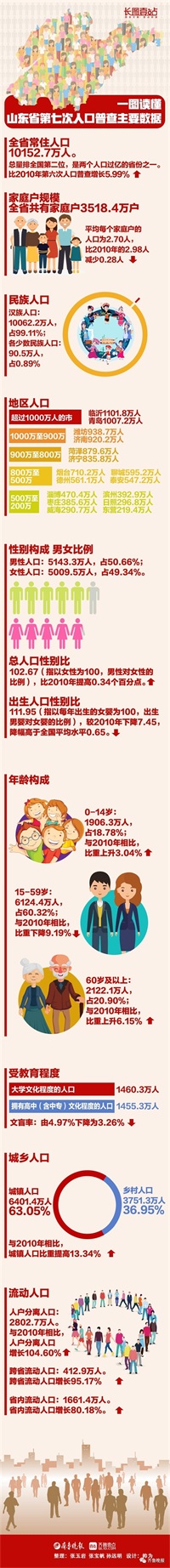 山东全省常住人口为10152.7万人。从地区人口看,16个地级市中,人口超过1000万人的市有2个,分别是临沂市1101.8万人、青岛市1007.2万人,其中青岛市常住人口首次突破1000万。有2个市在1000万人至900万人之间,分别是潍坊市938.7万人、济南市920.2万人。