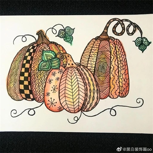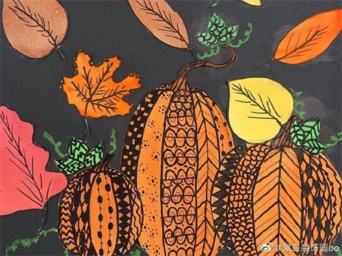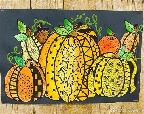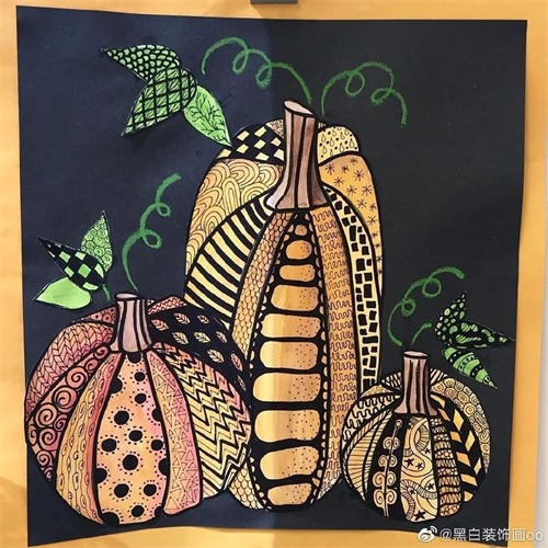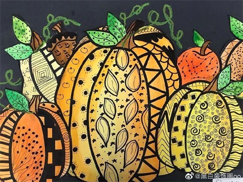 作画方式:在素描纸上画出南瓜的轮廓造型,取出黄色彩色笔画出南瓜的固有色即黄色,然后用勾线笔勾出南瓜的花纹及叶子。完成之后,再用剪刀剪出南瓜造型,用胶水贴在黑色卡纸上。
