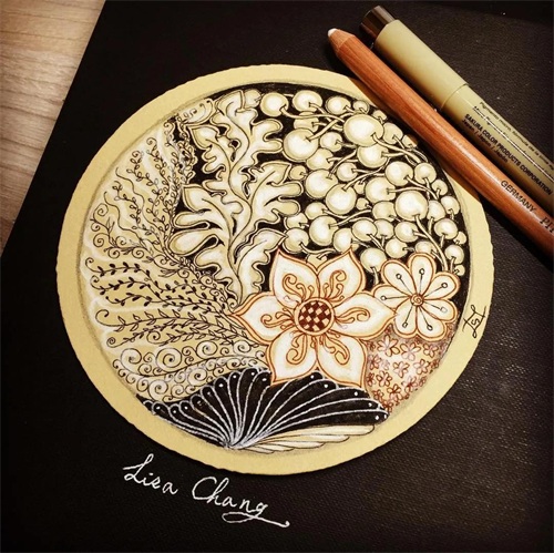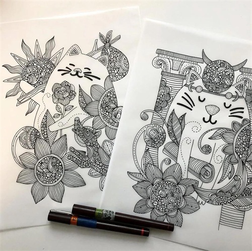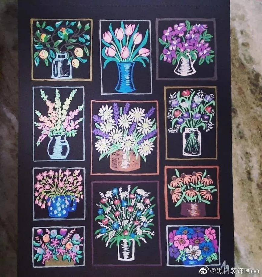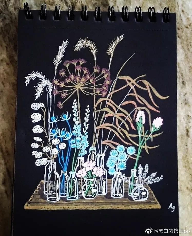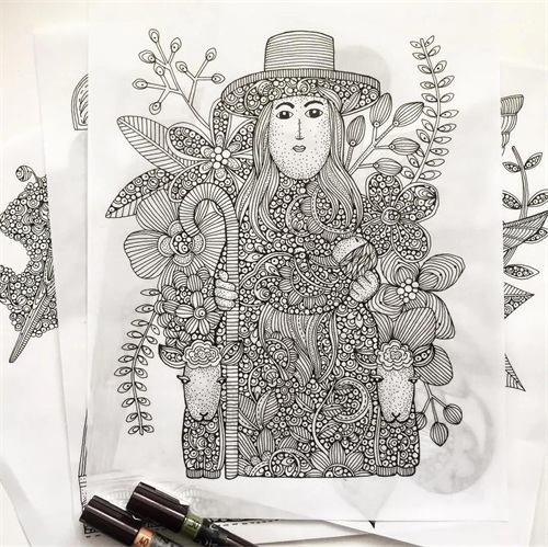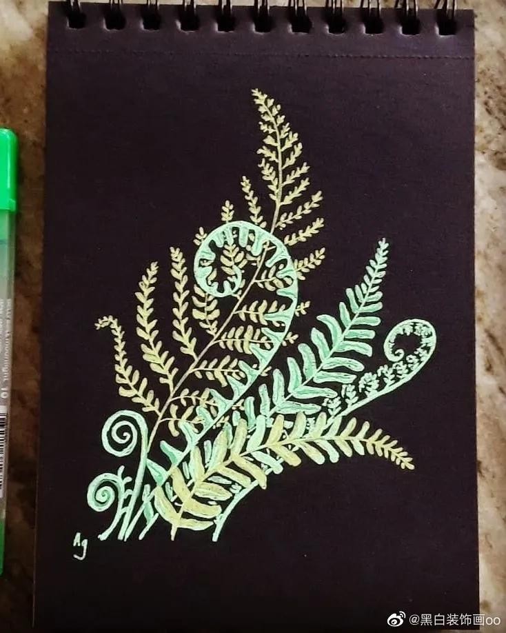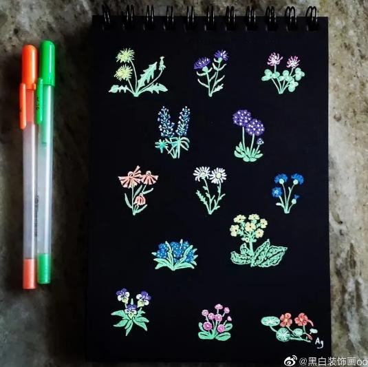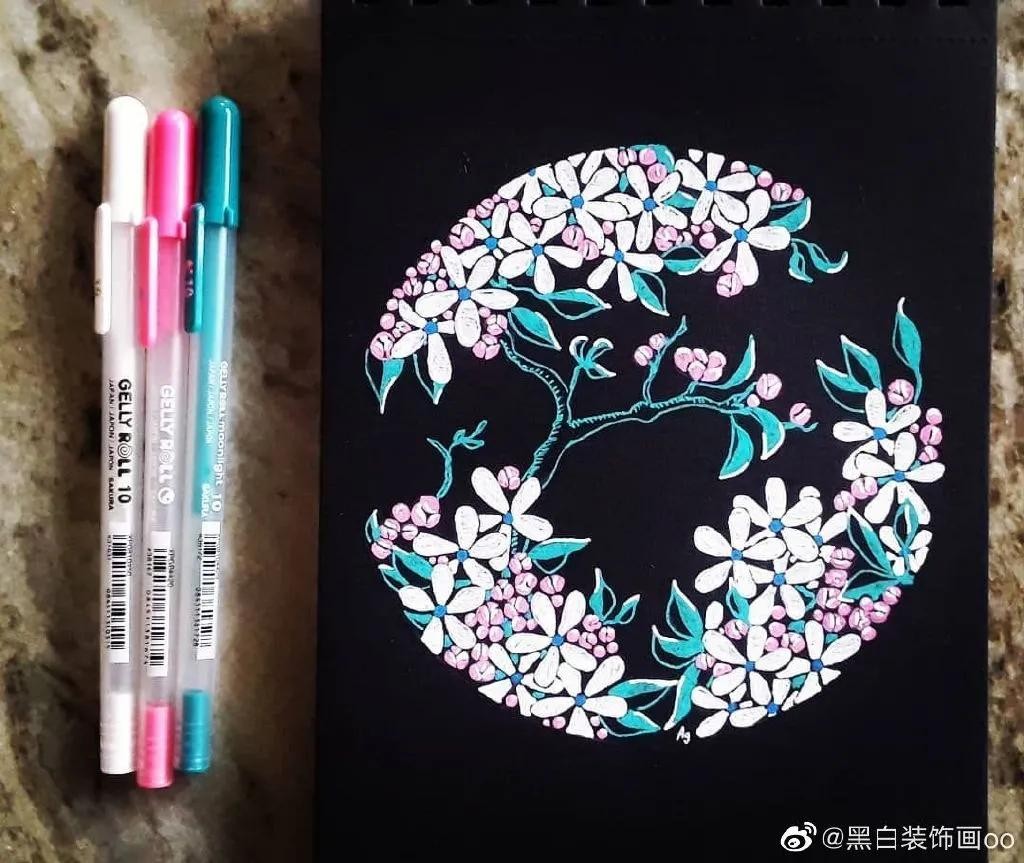 作画方式:由于彩色笔跟黑色卡纸形成颜色的反差,所以很多插画师,喜欢用彩色笔、白色樱花高光笔勾线上色。