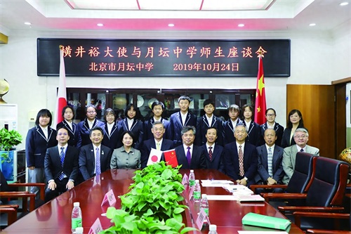 2019年10月24日,时任日本驻华大使横井裕(前排左四)携夫人横井英子(前排左三)访问月坛中学并与师生座谈