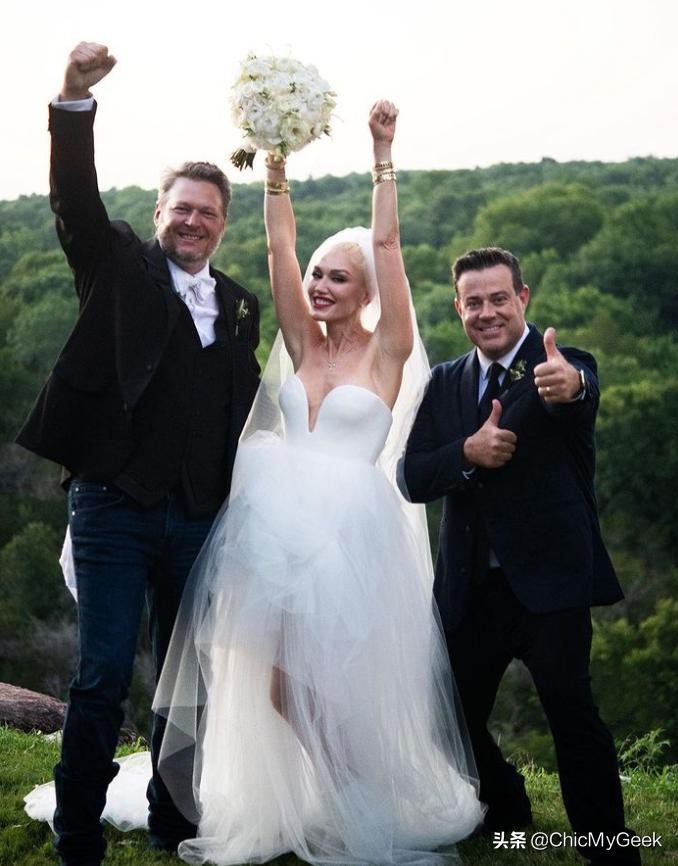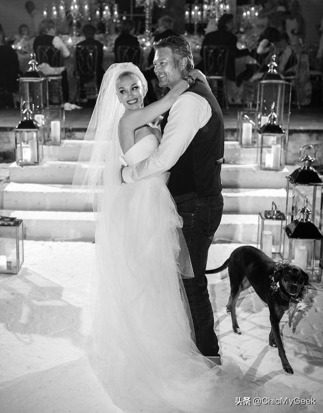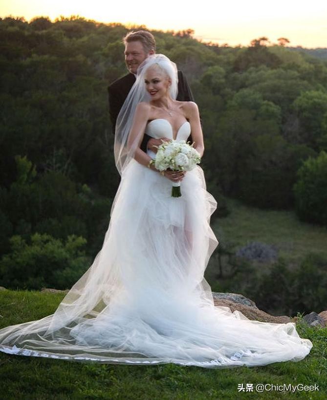 而格温·史蒂芬妮婚礼上有两套来自Vera Wang的婚纱。婚纱背后看不见的小巧思是在刺绣上也绣有三只小巧的小鸟,是为了呼应格温·史蒂芬妮的三个可爱孩子。