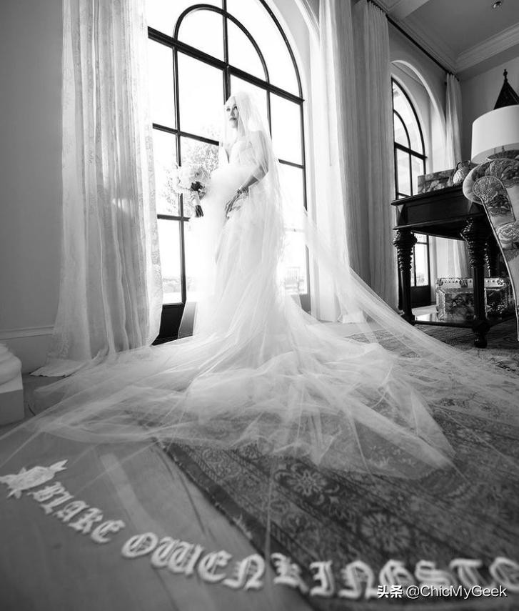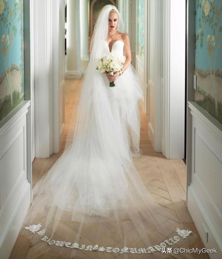 格温·史蒂芬妮的这套Vera Wang仙气十足婚纱,长到拖地的头纱上还特别绣上老公、自己和三个小孩的的名字:Blake、Gwen、Kingston、Zuma&Apollo ,温馨又可爱。