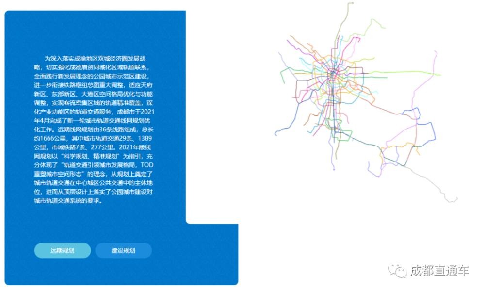远期线网规划由36条线路组成,总长约1666公里,其中城市轨道交通29条、1389公里,市域铁路7条、277公里。2021年版线网规划以“科学规划、精准规划”为指引,充分体现了“轨道交通引领城市发展格局,TOD重塑城市空间形态”的理念,从规划上奠定了城市轨道交通在中心城区公共交通中的主体地位,进而从顶层设计上落实了公园城市建设对城市轨道交通系统的要求。