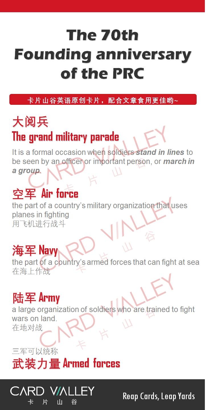 为了让大家更好地跟老外普及中国的力量,我们来总结一下和这次阅兵相关的表达吧!