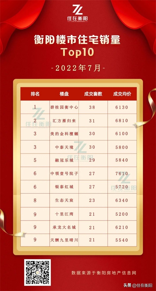 衡阳楼市7月住宅销量榜单出炉,多楼盘均价上涨