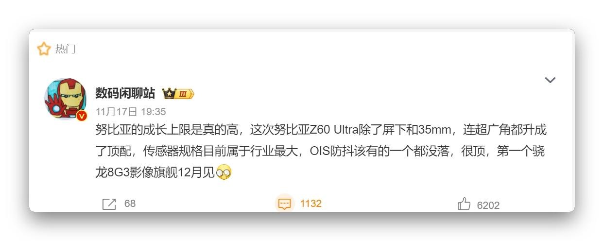 根据数码博主 @数码闲聊站 的爆料,中兴系新旗舰手机将采用大电池设计,其中努比亚 Z60 Ultra 手机将配备6000mAh大电池,并且采用了屏下前摄影像技术。