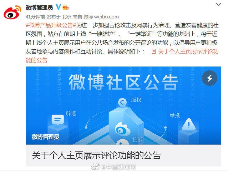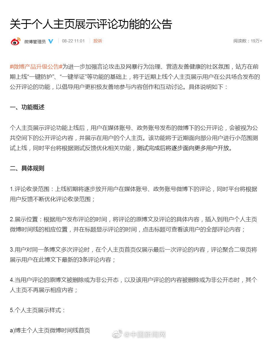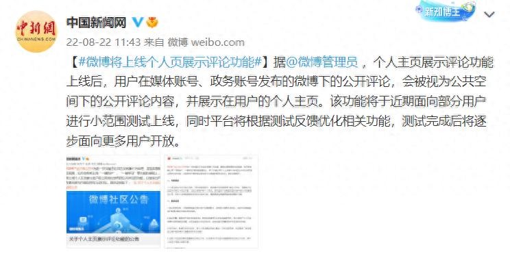 据@微博管理员,个人主页展示评论功能上线后,用户在媒体账号、政务账号发布的微博下的公开评论,会被视为公共空间下的公开评论内容,并展示在用户的个人主页。该功能将于近期面向部分用户进行小范围测试上线,同时平台将根据测试反馈优化相关功能,测试完成后将逐步面向更多用户开放。