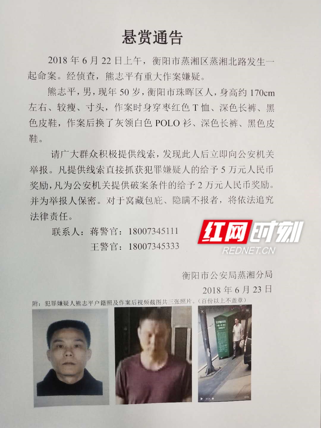 红网时刻衡阳6月23日讯(记者 宋美君)今天,记者从衡阳市公安局获悉,6月22日下午,衡阳市律师金某被杀,警方经过缜密侦查案件已有最新进展,锁定熊志平有重大作案嫌疑。现公安部门发出悬赏通告缉拿杀害律师嫌凶。凡提供线索直接抓获犯罪嫌疑人的直接给予5万元奖励;凡是为公安机关提供破案条件的,给予2万元奖励。