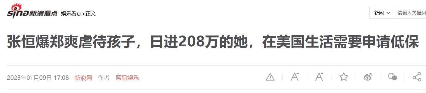 信源2:新浪网 2023年01月09日 17:08 《张恒爆郑爽虐待孩子,日进208万的她,在美国生活需要申请低保》