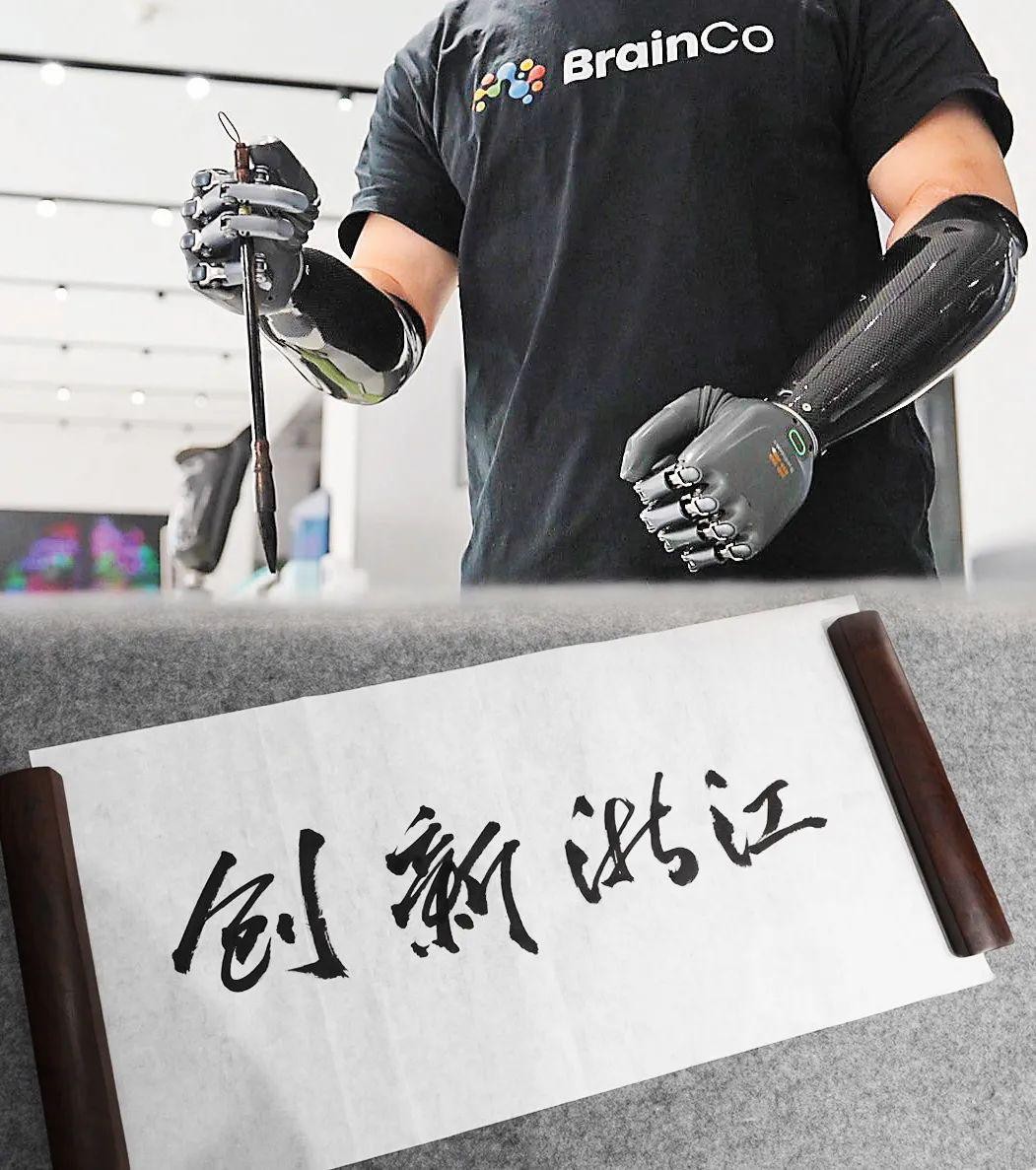 强脑科技体验官、原残疾人运动员倪敏成用仿生手写下“创新浙江”。(记者 陈晓驰 摄)